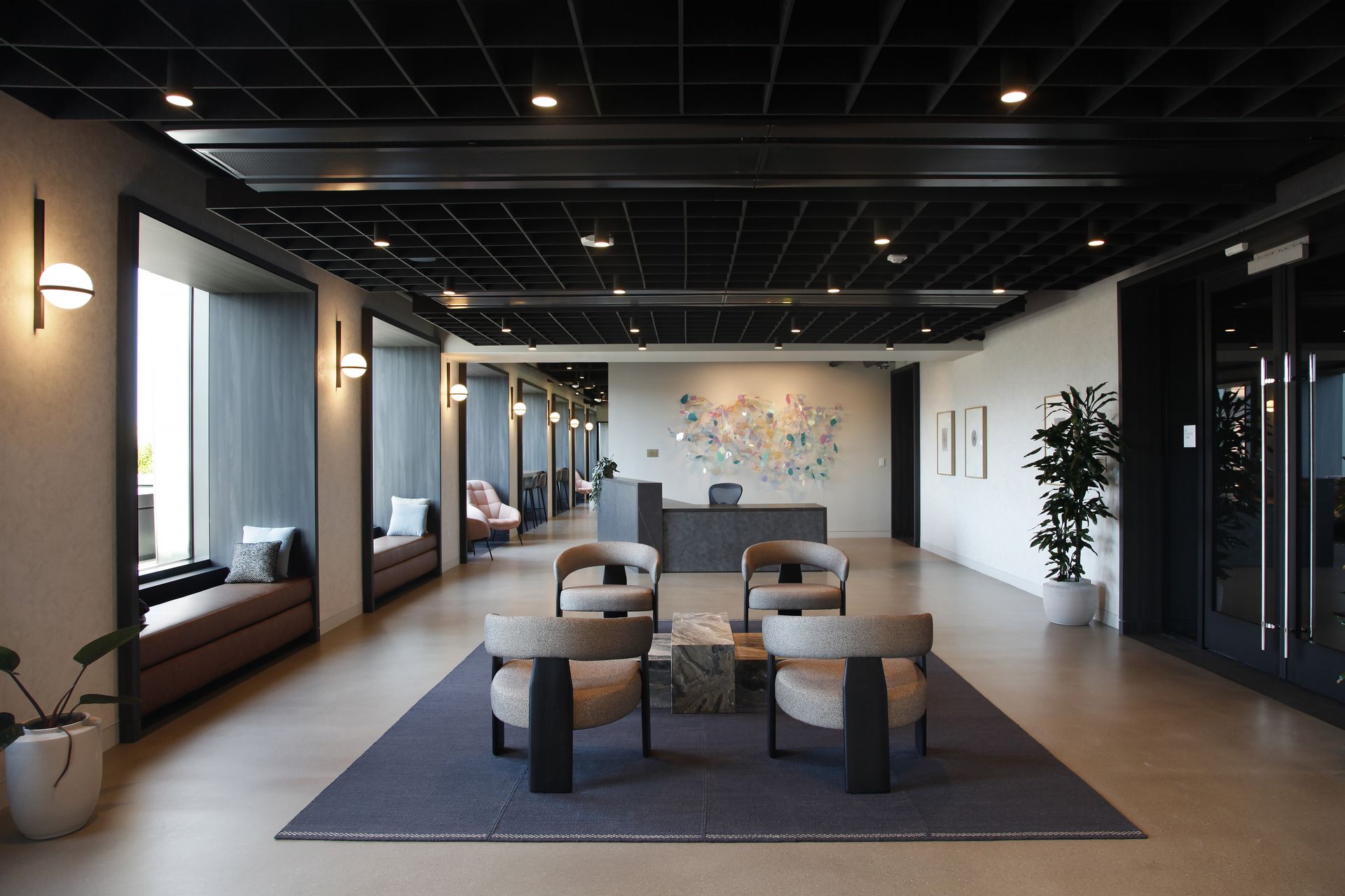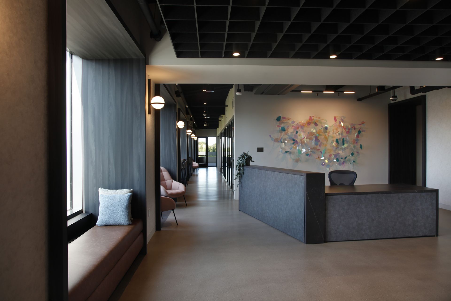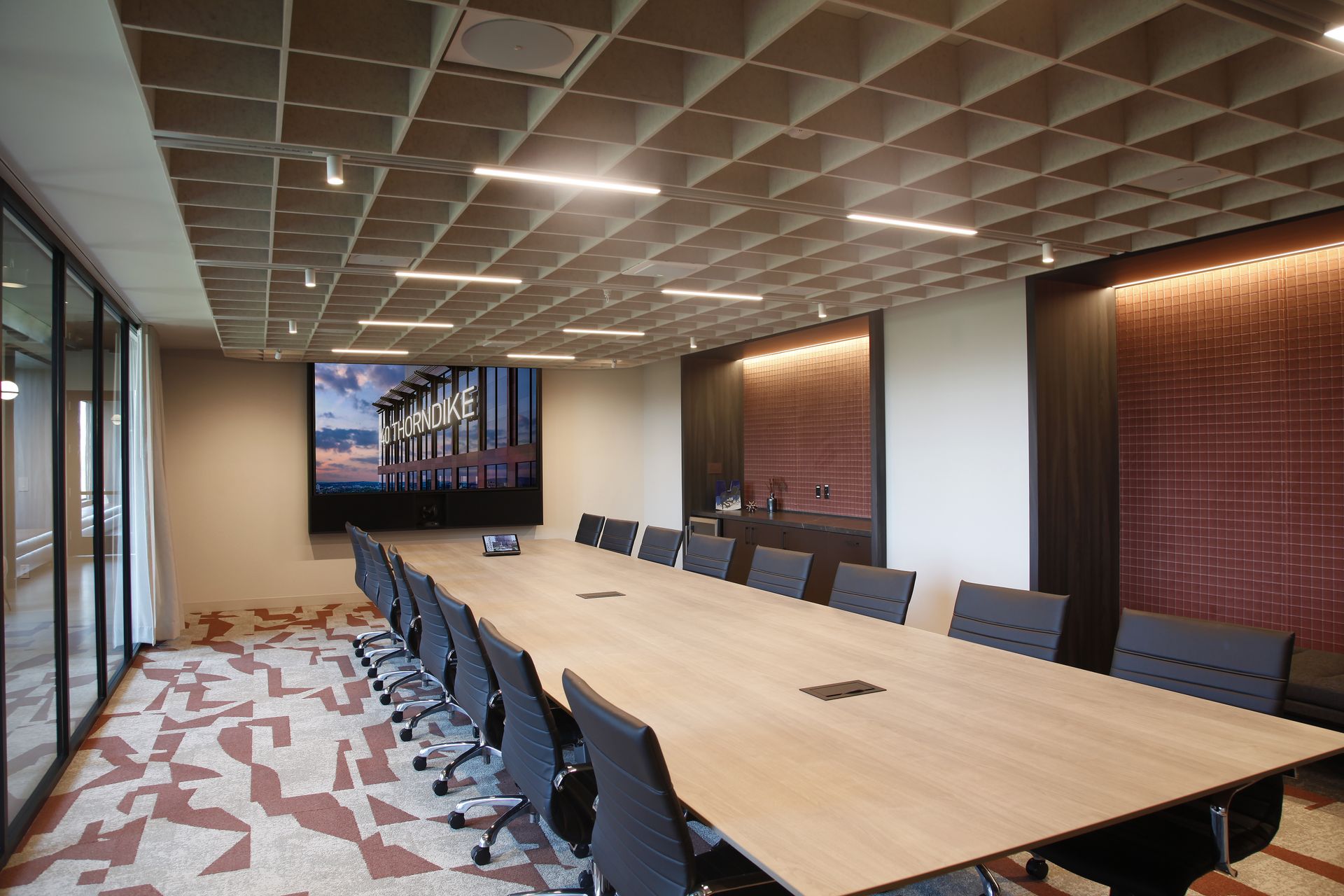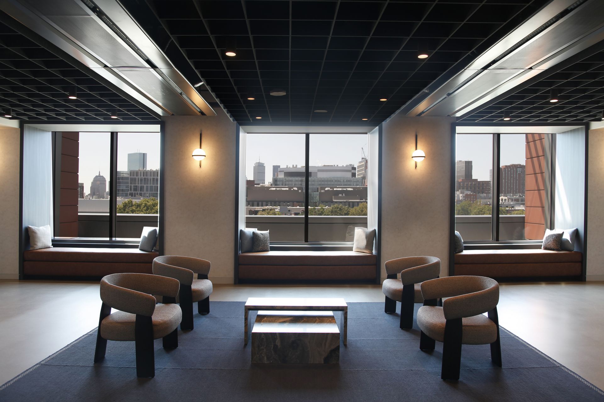 The former Cambridge city brutalist courthouse and jail has been transformed into a vibrant Class A office building, requiring top-tier amenity spaces to compete in a crowded market. Leggat McCall Properties tasked Studio Troika with designing 11,500 square feet of 5th floor meeting spaces and lounge that creates a distinct identity for the building.