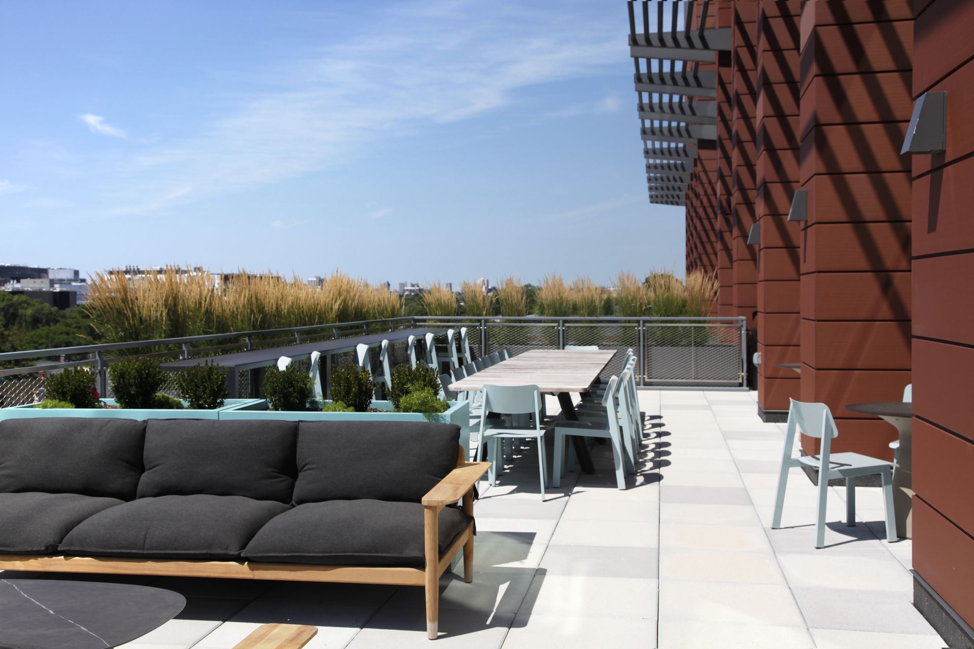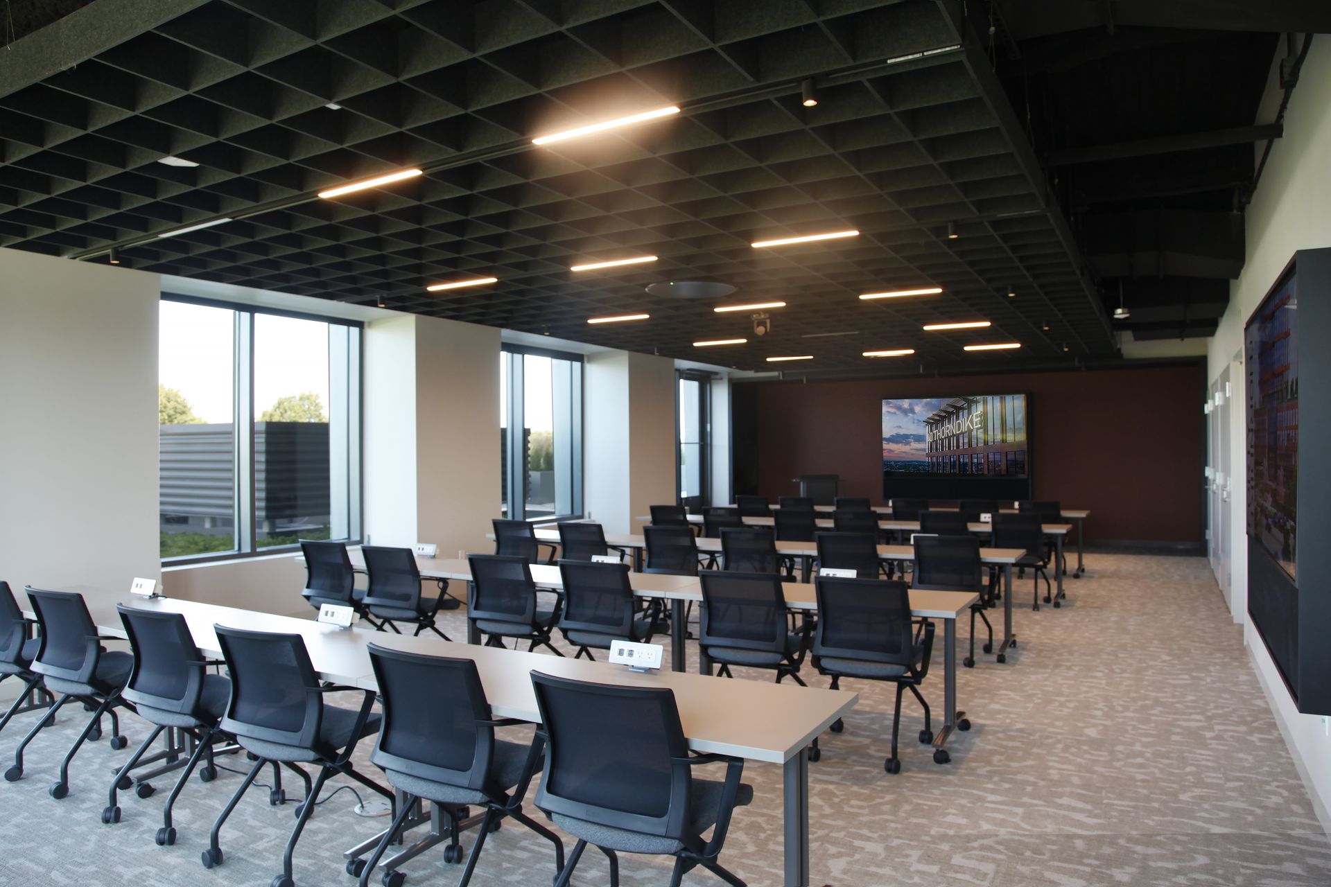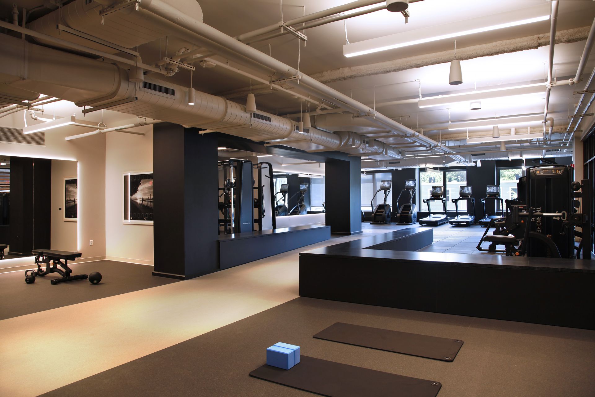 The second floor of 40 Thorndike offers 5,500 square feet of fitness and locker room space that is designed to afford flexibility for evolving fitness trends, while minimizing any noise transmission to adjacent residences. These fitness spaces pick up on the qualities of light and materiality from the major amenity spaces on the upper level, preserving a sense of continuity from one floor to another.
