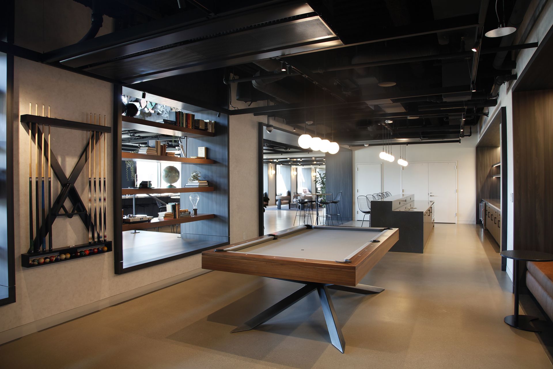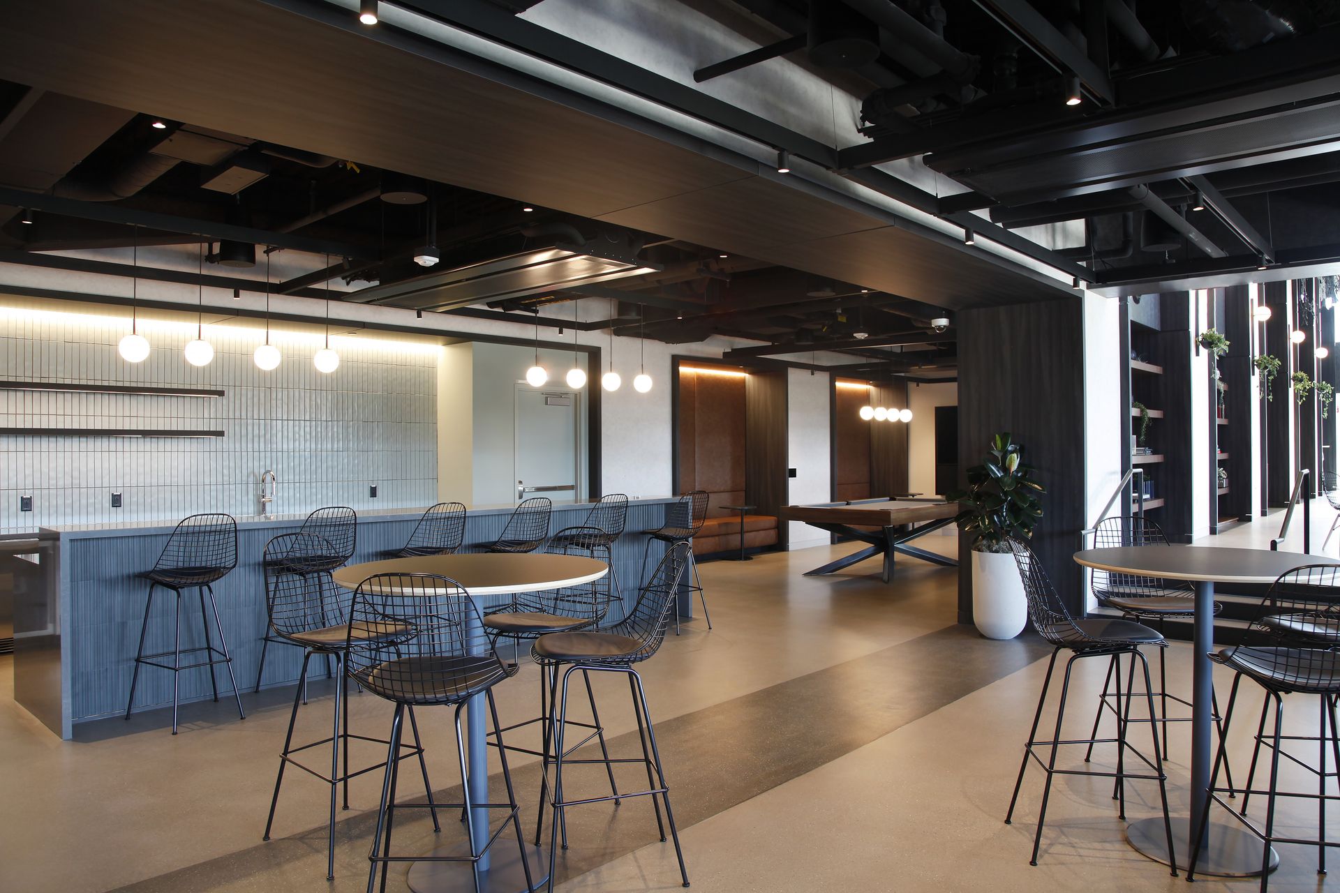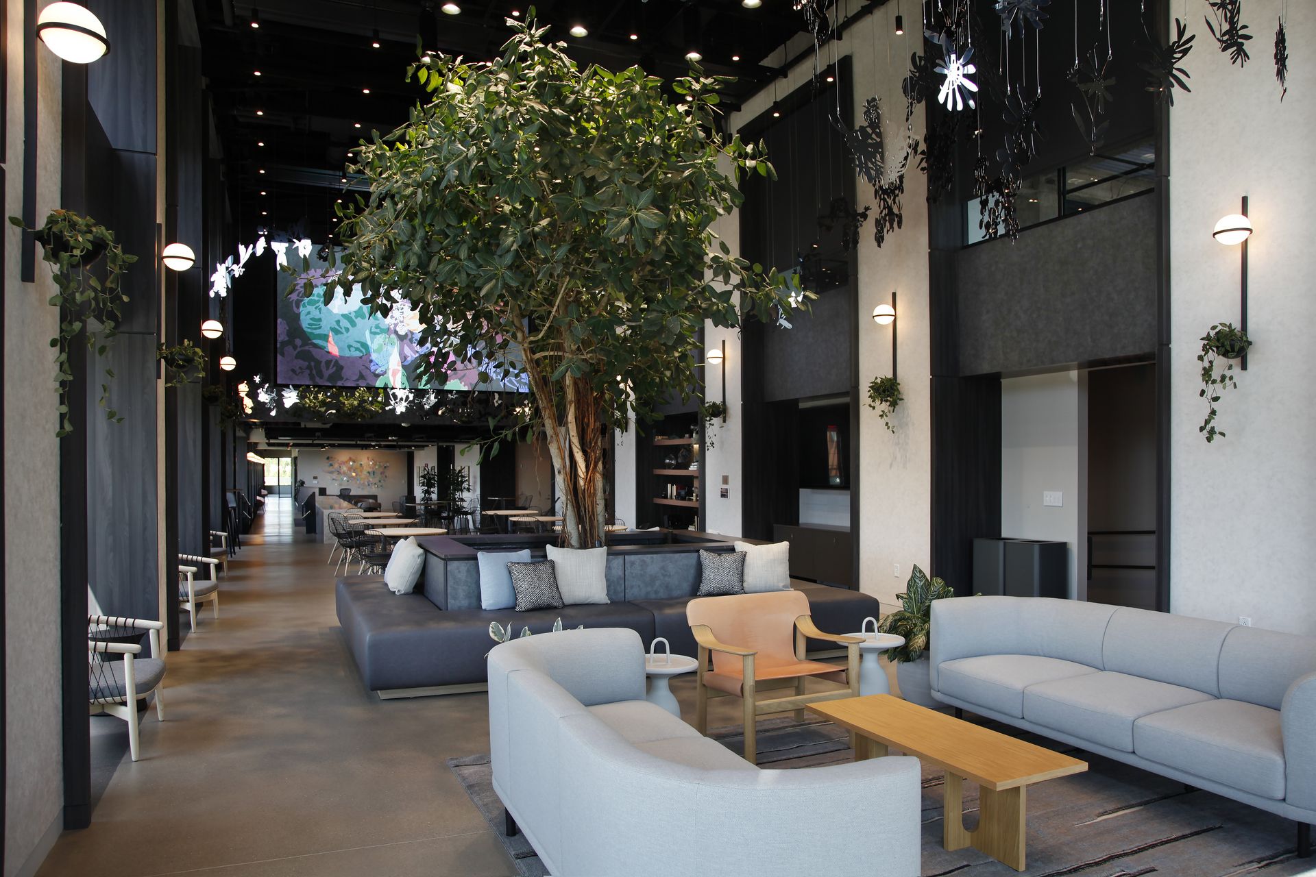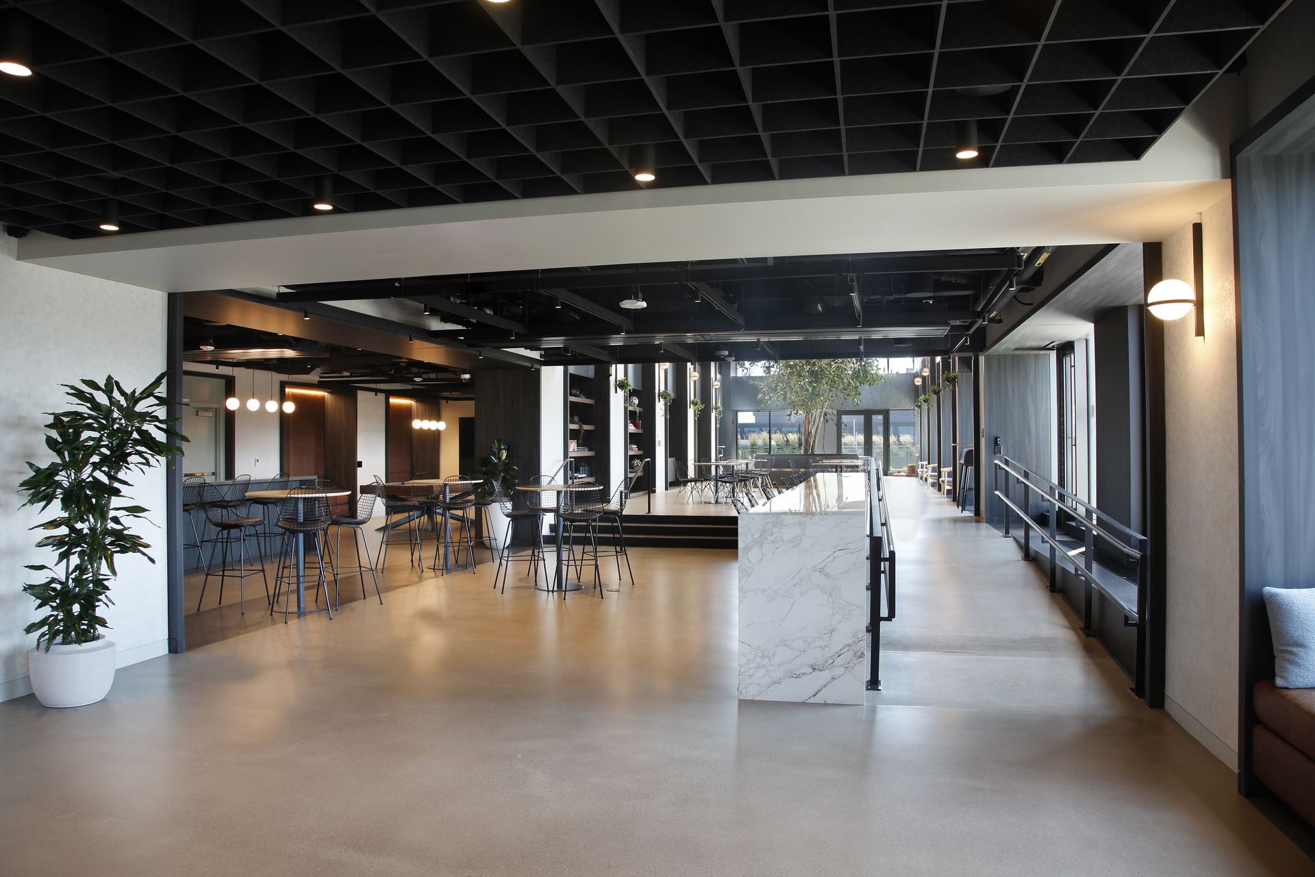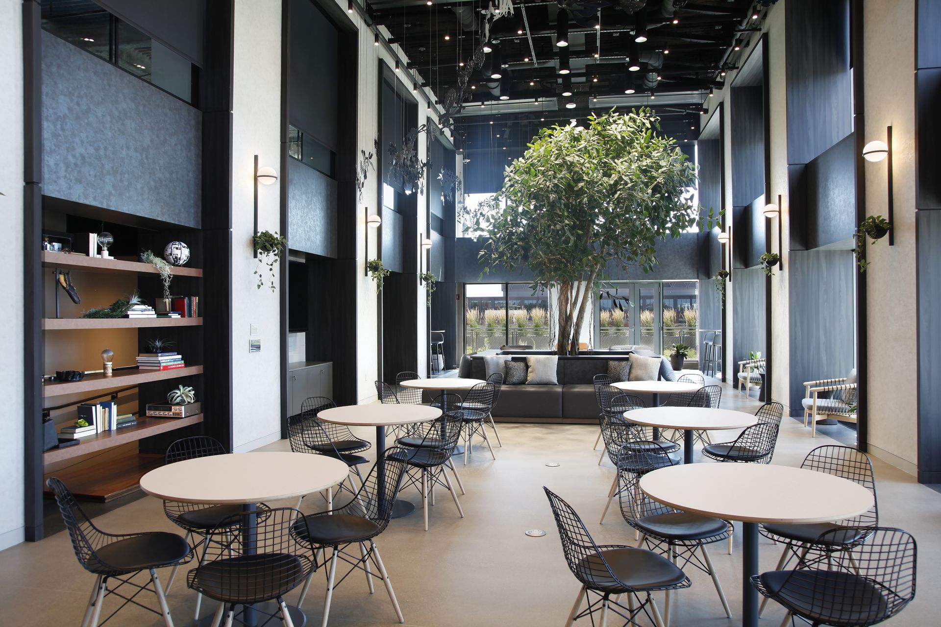 The design shifts all circulation along the exterior facade and creates a unifying rhythm of window frames that tie together the program elements, emphasize the building’s existing character, and carve out space for quick, informal activities and dialogue. The experience is elevated with a palette of high-contrast materials, industrial elements, and integral greenery, culminating in a central, full-size tree.